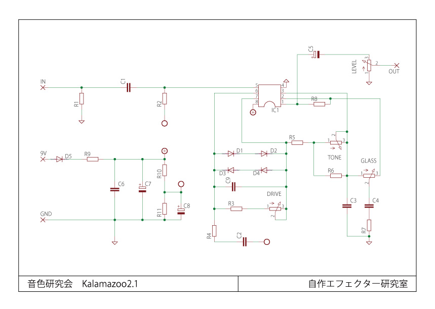 【音色研究会】Kalamazoo2.1回路図 回路 2025.05.192025.05.29 音色研究会「Kalamazoo風オーバードライブVer2.1」の回路図です。 【音色研究会】Kalamazoo風オーバードライブ自作基板 Kalamazoo風オーバードライブ自作基板アンプにハリと艶を加えるブースター・オーバードライブペダルKlon Centaurと似たペダルとして絶賛されたKalamazooを再現した基板です。 【音色研究会】MorningGlory2.0部品配置図 https://tsa.plaisir-pc.com/wp-content/uploads/2024/02/Kalamazoo2.1%EF%BC%88%E6%94%B9%E5%AE%9A1%EF%BC%89.pdf