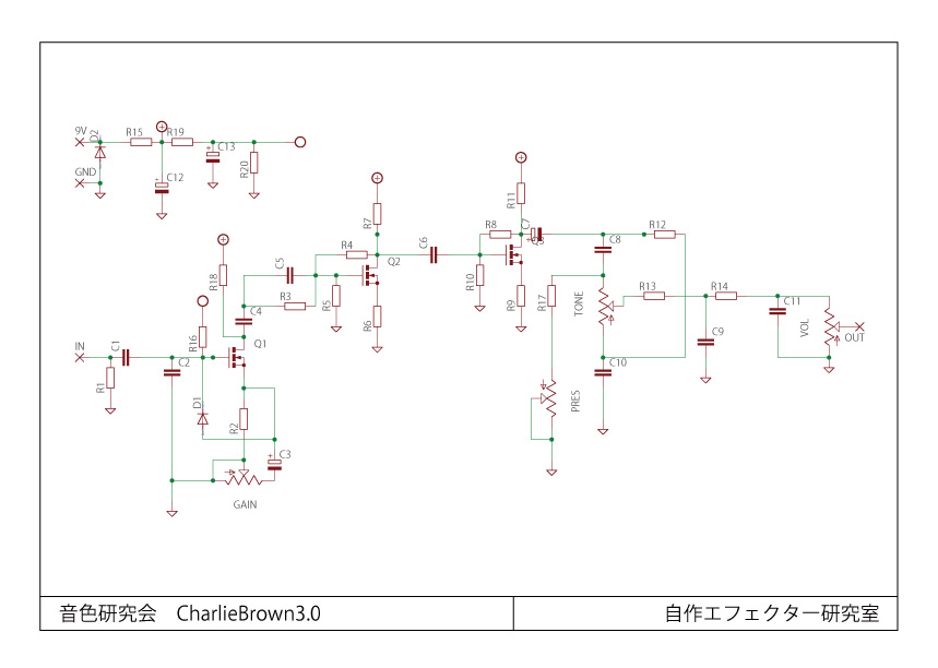 音色研究会「CharlieBrown風オーバードライブVer3.0」の回路図です。