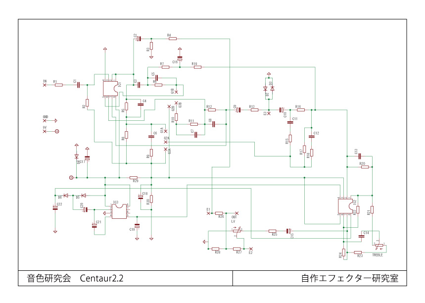 【音色研究会】Centaur2.2回路図 回路 2025.05.252025.05.29 音色研究会「Klon Centaur風オーバードライブVer2.2」の回路図です。 【音色研究会】Klon Centaur風オーバードライブ自作基板 Klon Centaur風オーバードライブ自作基板幻のオーバードライブブースターの名機、KLON CENTAURの音を再現した基板 オリジナルは生産数が少なく、プレミアムが付き高額になっています。 ブースターとして使われることが多く、太く、抜けるサウ 【音色研究会】Klon Centaur2.2部品配置図 https://tsa.plaisir-pc.com/wp-content/uploads/2024/02/centaur2.2%E9%83%A8%E5%93%81%E9%85%8D%E7%BD%AE%E5%9B%B3%EF%BC%88%E6%94%B9%E5%AE%9A3%EF%BC%89.pdf