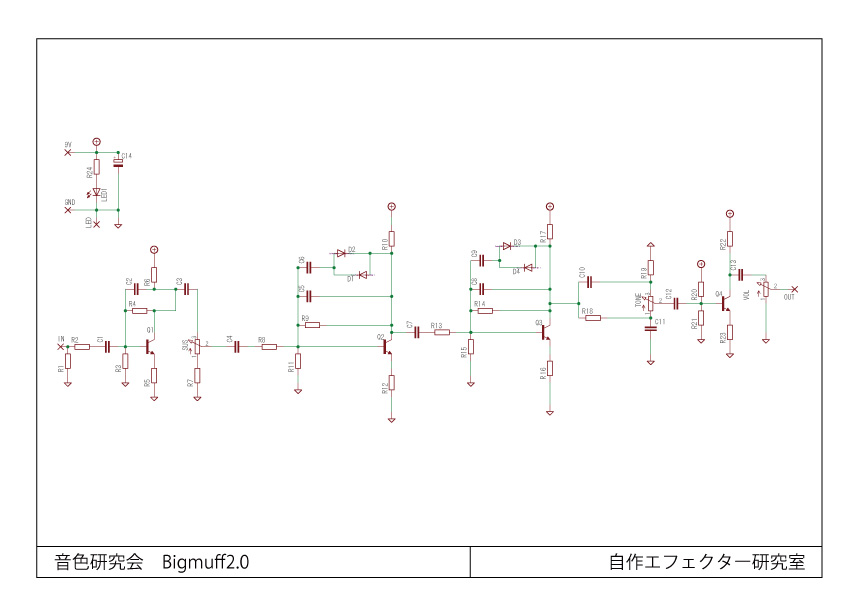 【音色研究会】Bigmuff回路図 回路 2025.06.09 【音色研究会】Bigmuff回路図 音色研究会「Bigmuff風ファズ自作基板」の回路図です。 【音色研究会】Bigmuff風ファズ自作基板 Bigmuff風ファズ自作基板Bigmuff風ファズ自作基板 Fuzz Faceと並んで人気を二分する定番ファズ、ビッグマフを再現した基板です。こちらは2000年ごろのVersion9をモチーフにしています。 ファズ特有のブチブチ 【音色研究会】Bigmuff風ファズ自作基板部品配置図 https://tsa.plaisir-pc.com/wp-content/uploads/2022/04/4000032-BigMuff2.0%E9%83%A8%E5%93%81%E9%85%8D%E7%BD%AE%E5%9B%B3%EF%BC%88%E6%94%B9%E5%AE%9A1%EF%BC%89.pdf